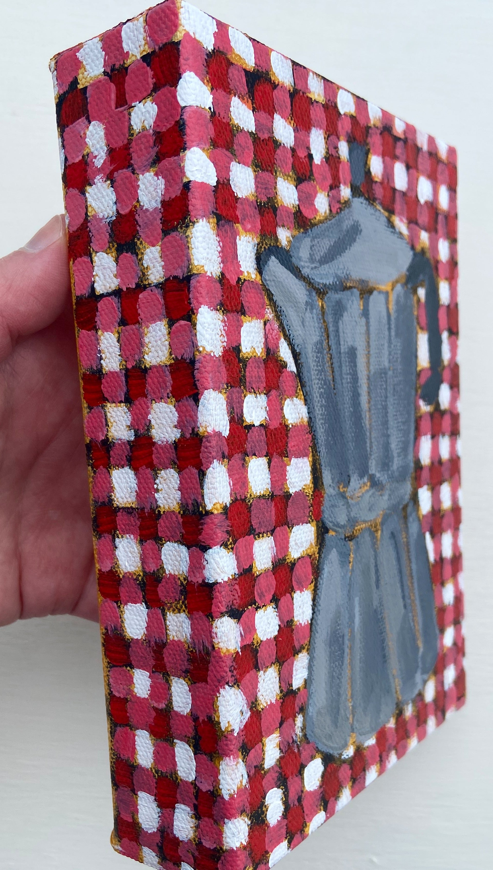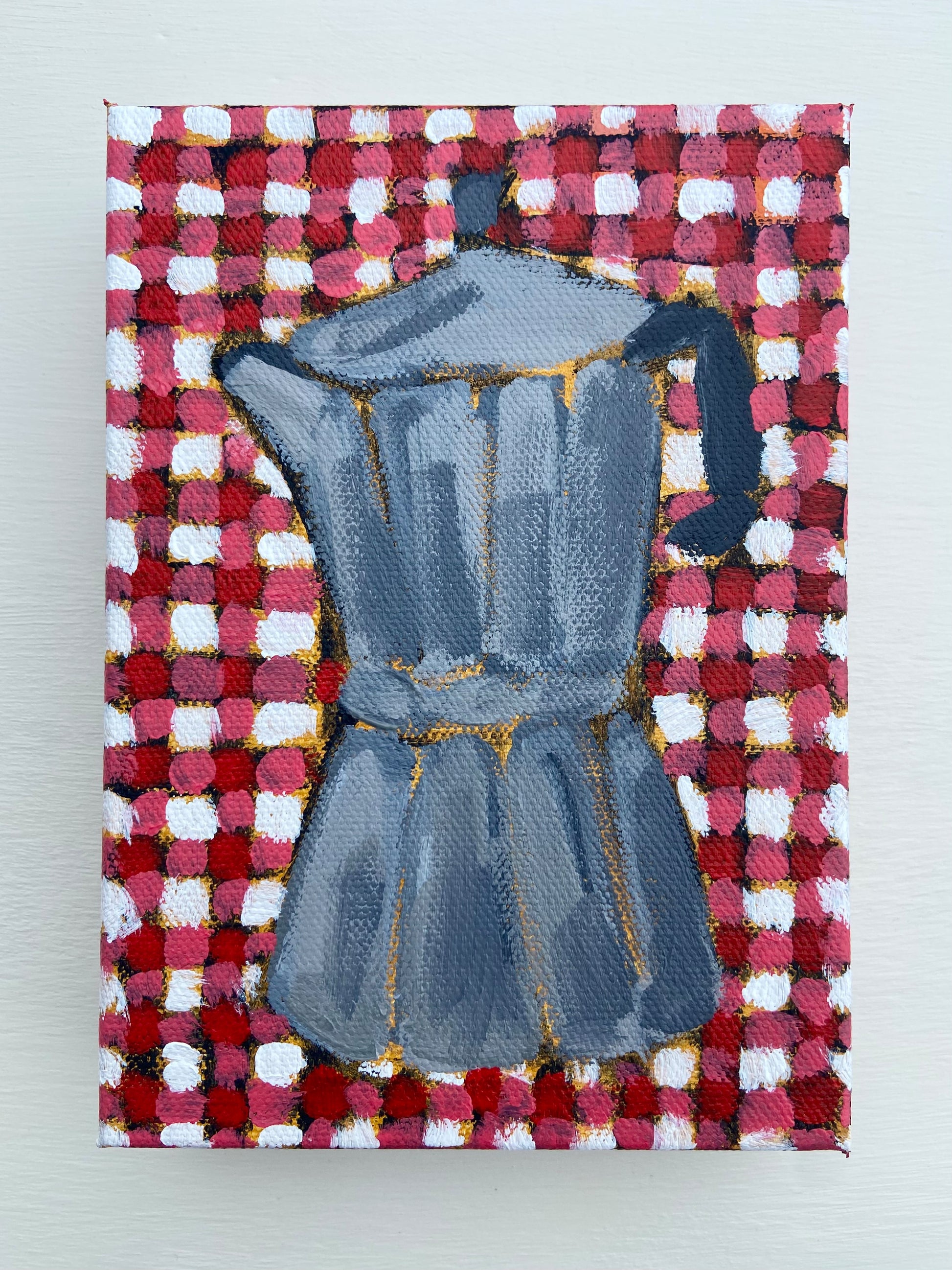 Pour me a cup of espresso. This mini painting is full of fun, featuring a Moka Pot on red gingham.