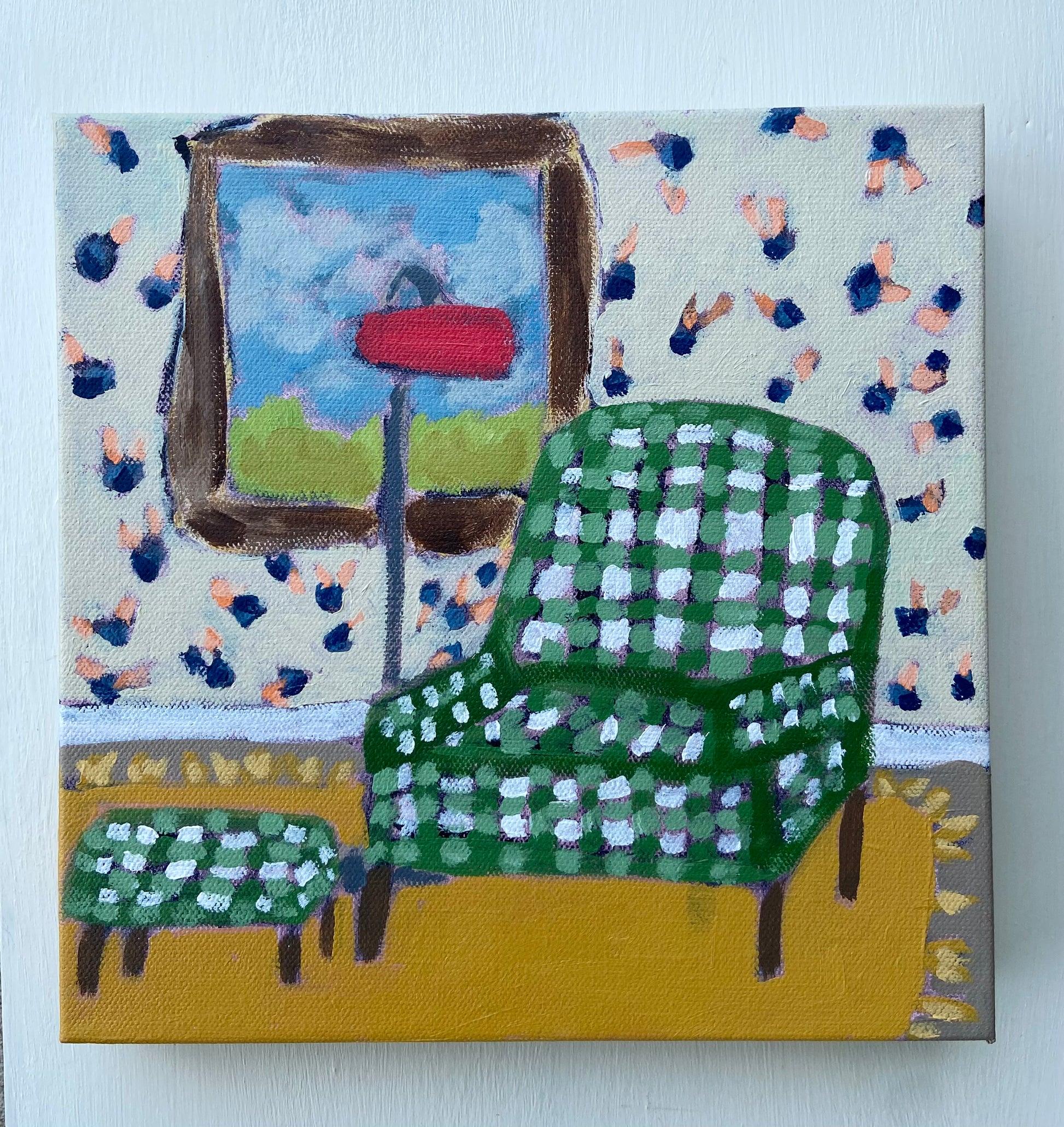 The best seat in the house is a green gingham chair. It's definitely my first choice for cozy sitting.